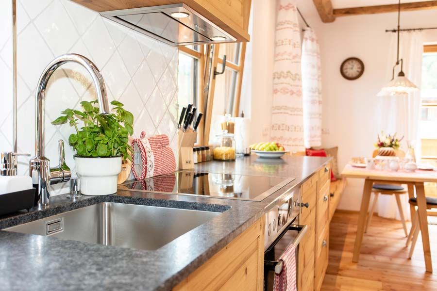 Auch die Küchenausstattung unserer Ferienwohnung "Steinernes Meer" lässt keine Wünsche offen! Die komplett ausgestattete Küchenzeile verfügt über: 4-Platten Cerankochfeld inkl. Backofen, Geschirrspüler, Kühlschrank mit Gefrierfach, Wasserkocher, Filterkaffeemaschine, Toaster und einem Sodastream mit Glasflaschen.